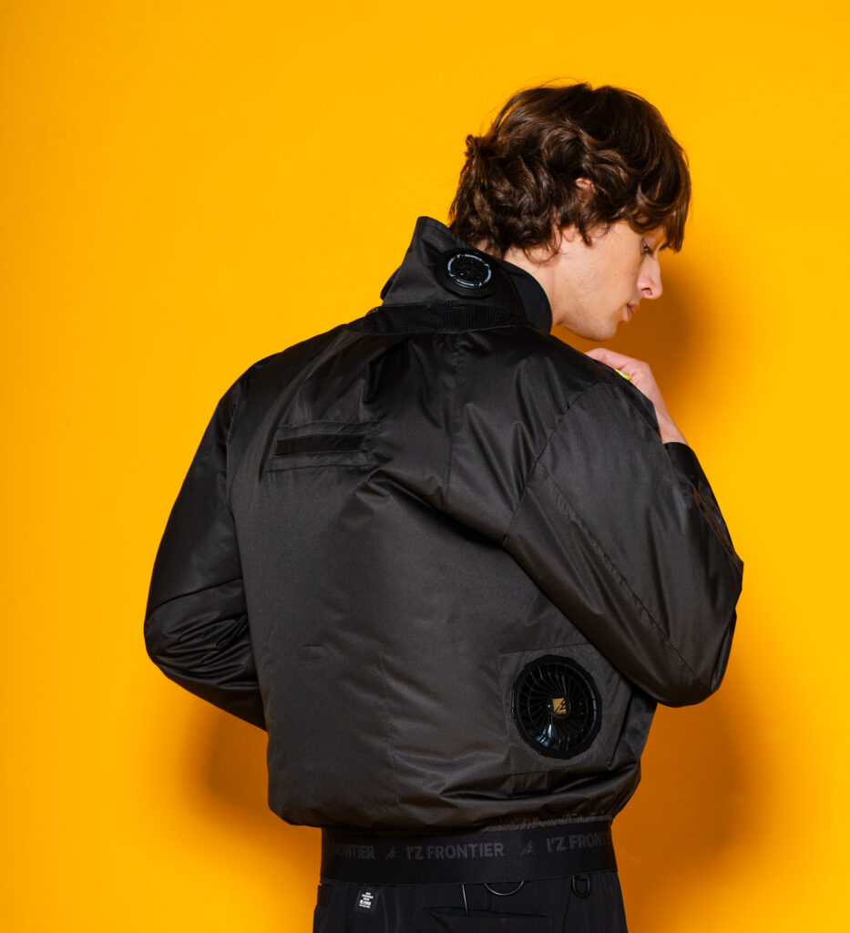 ・E.F.ファンからの出た風が効率よく衣服内を循環。また効率的に配置したメッシュから首廻りに向けて効率よく風が放出される特殊設計(特許出願中)