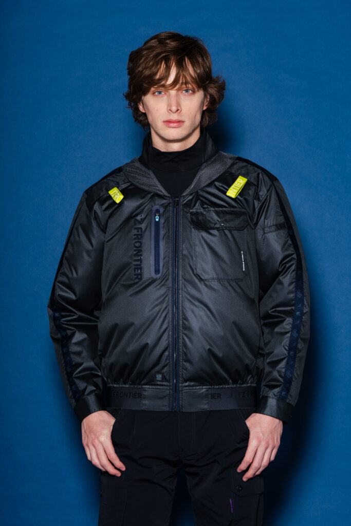 袖にデザインテープ、右胸ファスナー周りに圧着テープを使用してスポーツ感をアップ